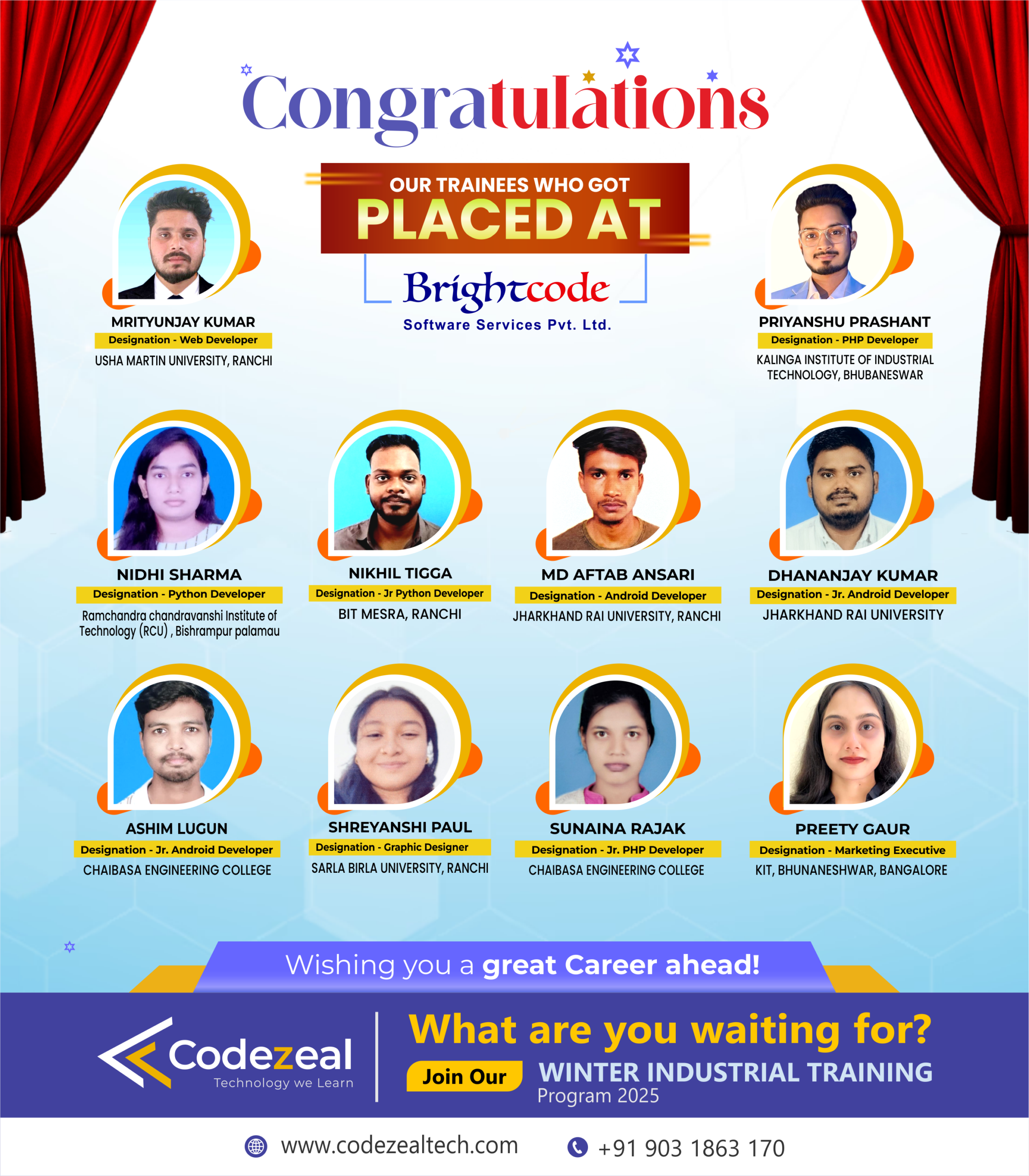 Codezeal Technology is a wing of Brightcode Software Services which is one of the leading software company in Ranchi with fortune of 1000+ clients. We focus on upbringing talent with diverse technology build industrial and corporate level trainings.